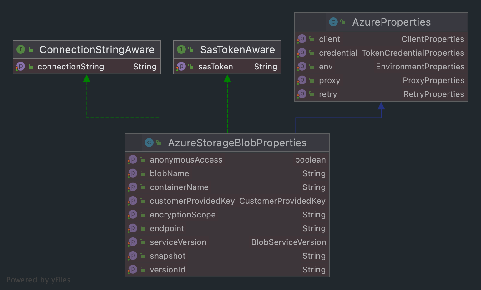 Define a couple of Aware interfaces, when a specific service properties class implements these interfaces it indicates this service has such ability. For example the Storage Blob could configure SAS token and connection string, the StorageBlobProperties could implement SasTokenAware and ConnectionStringAware.