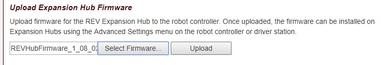 As an alternate, you can use the Manage interface from a connected laptop or Driver Station (DS) app to upload a Control Hub's firmware, or to update it using the included or uploaded version. New firmware images can be obtained from the REV Robotics website.