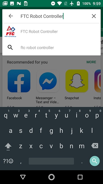 | 4. In the search window of the Google Play Store type in the words “FTC Robot Controller” to find the app in the Play Store.