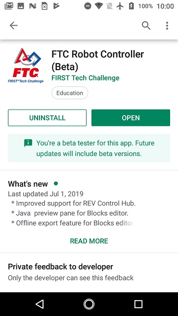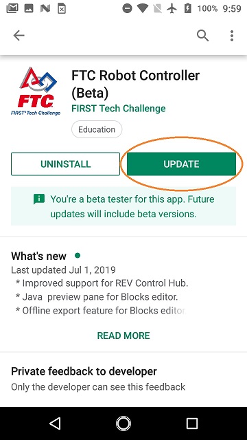 Important Note: if you are an Android Studio user, then you cannot use the Google Play Store to update your Robot Controller app. Instead, by updating to the newest version of the FTC Android Studio project folder, you will update the Robot Controller app when you build the project and install it on your smartphone. For the Skystone season, you can download the newest version of the project folder here.