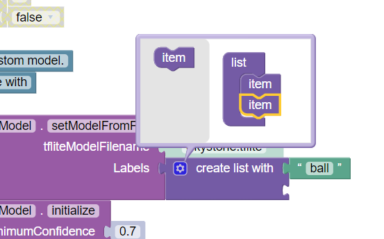 When you load an inference model, you must specify a list of labels that describe the known objects that are included in the model. For the "skystone.tflite" model, there are two known objects. The first object has a label of "Stone" and the second object has a label of "Skystone". Click on the little gear icon for the "create list with" block, and then drag a second item onto the list block, to change the number of items in the list from one to two.