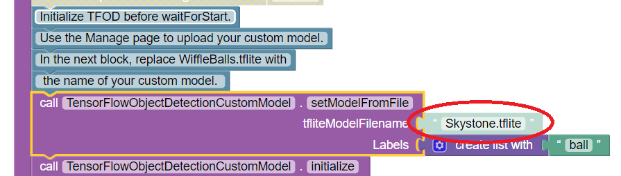 Look in the op mode for the programming block "TensorFlowObjectDetectionCustomModel.setModelFromFile" and change the "tfliteModelFilename" from its default value of "WiffleBalls.tflite" to the name of the .tflite file that you uploaded to your robot controller.