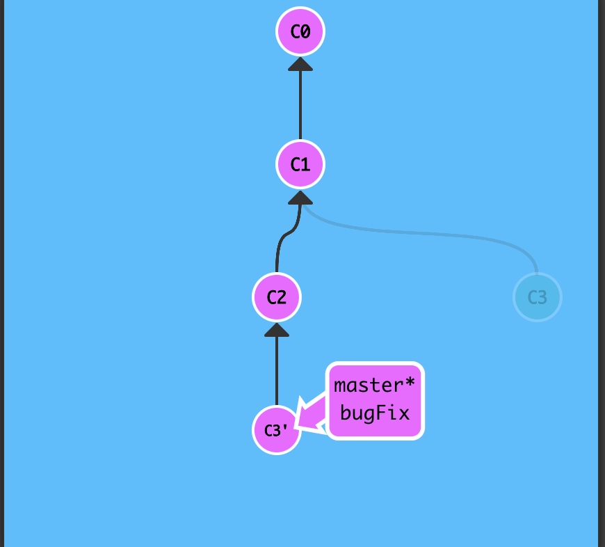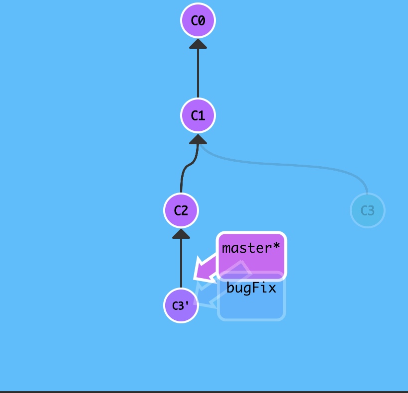 注意,提交记录 C3 依然存在(树上那个半透明的节点),而 C3' 是我们 Rebase 到 master 分支上的 C3 的副本。