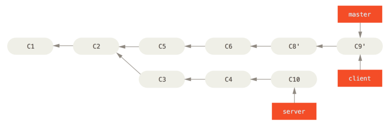 假设你希望将 client 中的修改合并到主分支并发布,但暂时并不想合并 server 中的修改,因为它们还需要经过更全面的测试。 这时,你就可以使用 git rebase 命令的 --onto 选项,选中在 client 分支里但不在 server 分支里的修改(即 C8 和 C9),将它们在 master 分支上重放:
