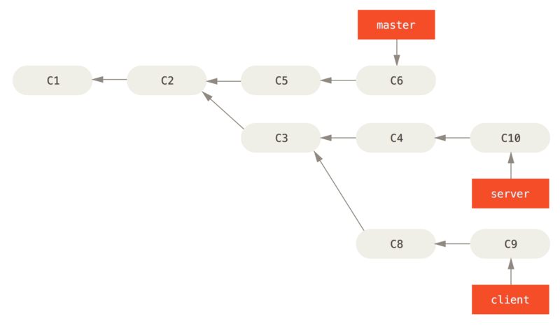 $ git rebase --onto master server client以上命令的意思是:“取出 client 分支,找出处于 client 分支和 server 分支的共同祖先之后的修改,然后把它们在 master 分支上重放一遍”。 这理解起来有一点复杂,不过效果非常酷。