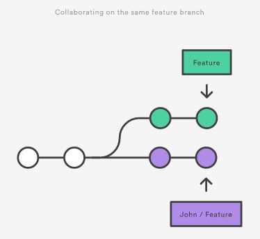 如你和你的同事John都工作在一个feature开发上,你和他分别做了一些commit,随后你fetch了John的feature分支(或者已经被John分享到中央库的feature分支),那么你的repo的版本历史可能已经是下面的样子了: