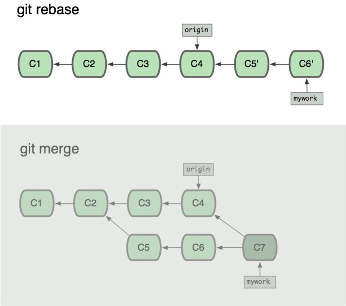 这些命令会把你的"mywork"分支里的每个提交(commit)取消掉,并且把它们临时保存为补丁(patch)(这些补丁放到".git/rebase"目录中),然后把"mywork"分支更新 为最新的"origin"分支,最后把保存的这些补丁应用到"mywork"分支上。