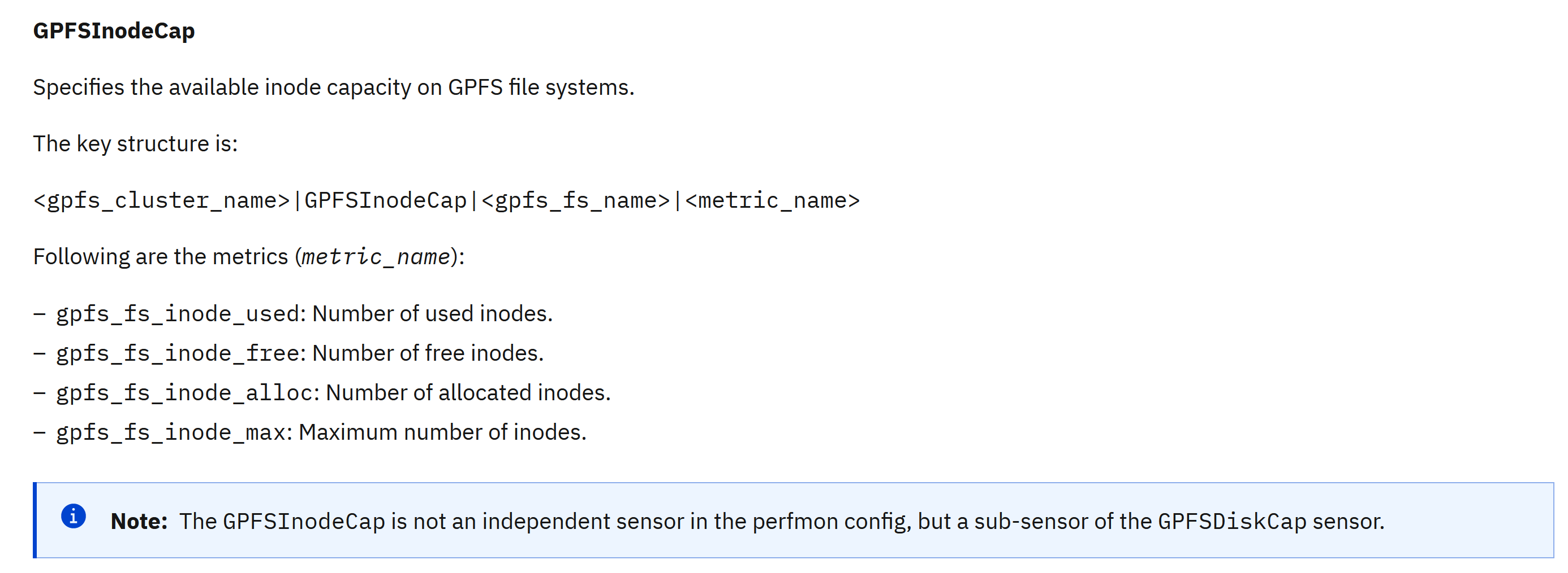 [root@scale-11 ~]# mmperfmon config show ... sensors = { ... { name = "GPFSDiskCap" period = 86400 restrict = "@CLUSTER_PERF_SENSOR" }, ... }