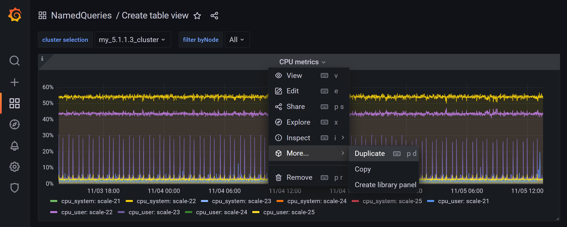In addition to a time series Graph, Grafana offers a variety of visualizations to support different use cases. For example, for raw data inspections or by creating statistical overviews, a Table display mode might be very helpful vizualization type. The table panel visualization is very flexible, supporting multiple modes for time series and for tables, annotation, and raw JSON data.