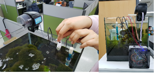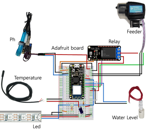아래의 그림과 같이 수조에 온도센서, pH센서, 수위센서, feeder와 LED를 설치하고,