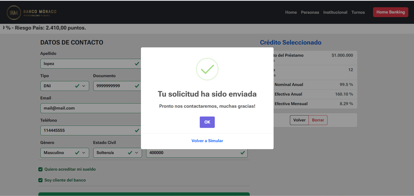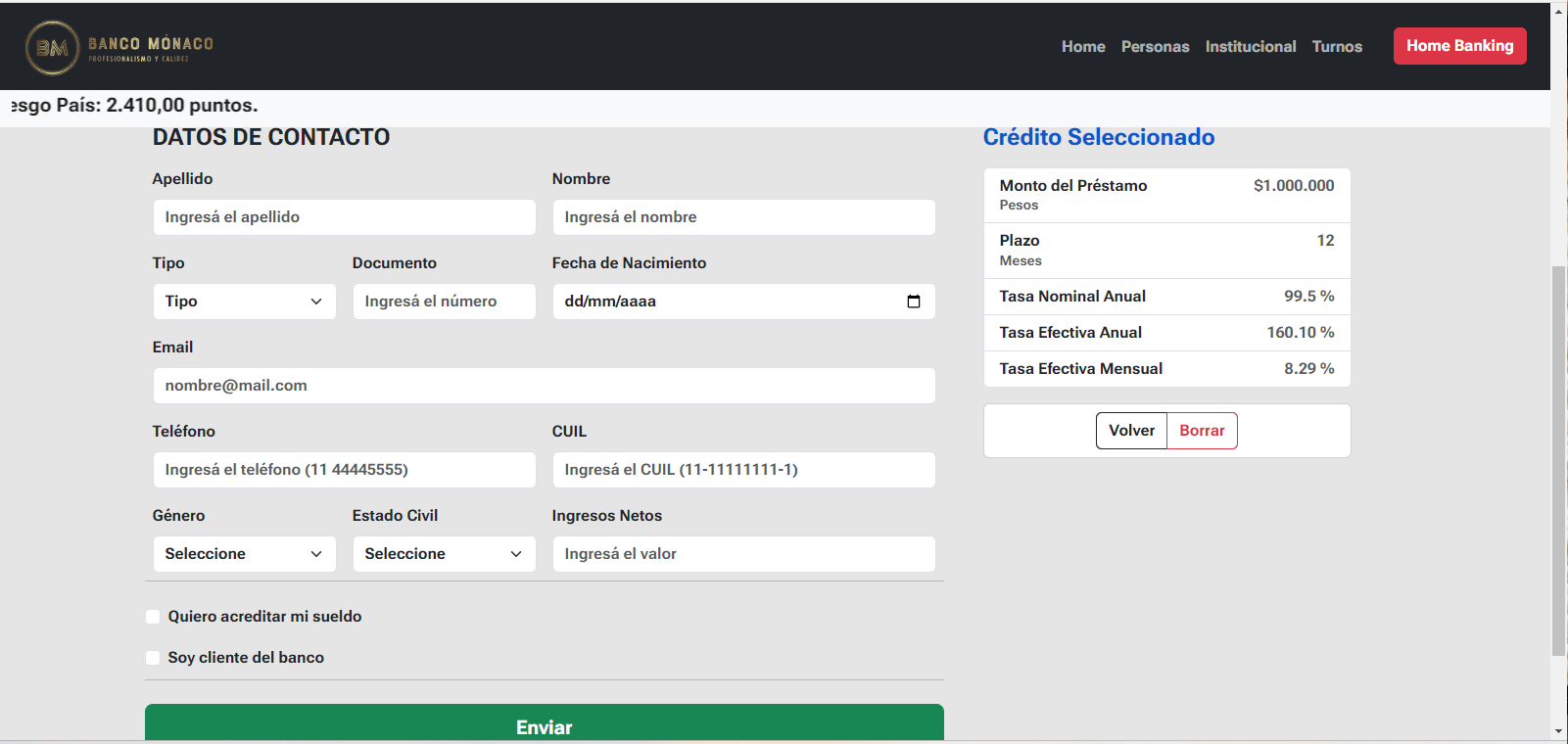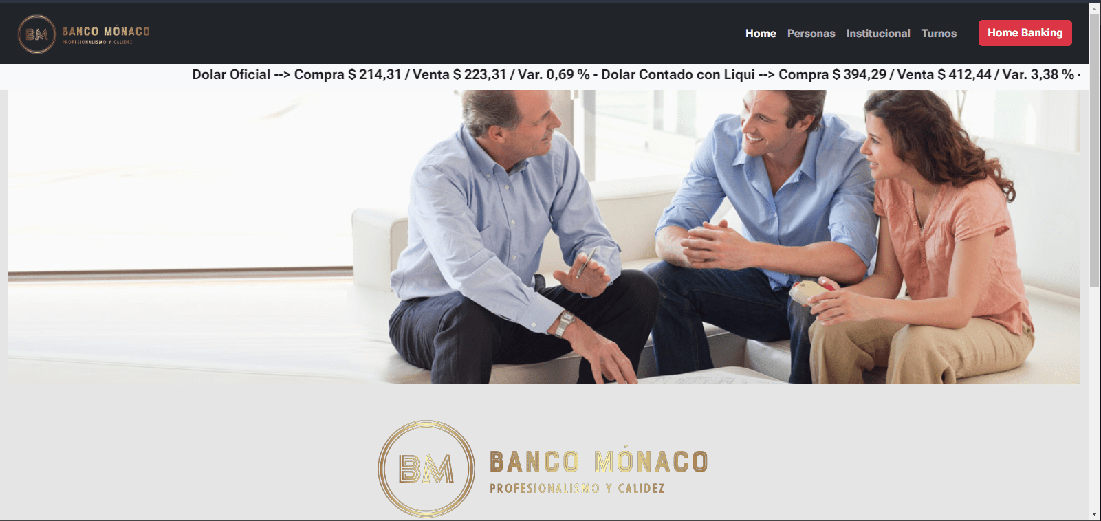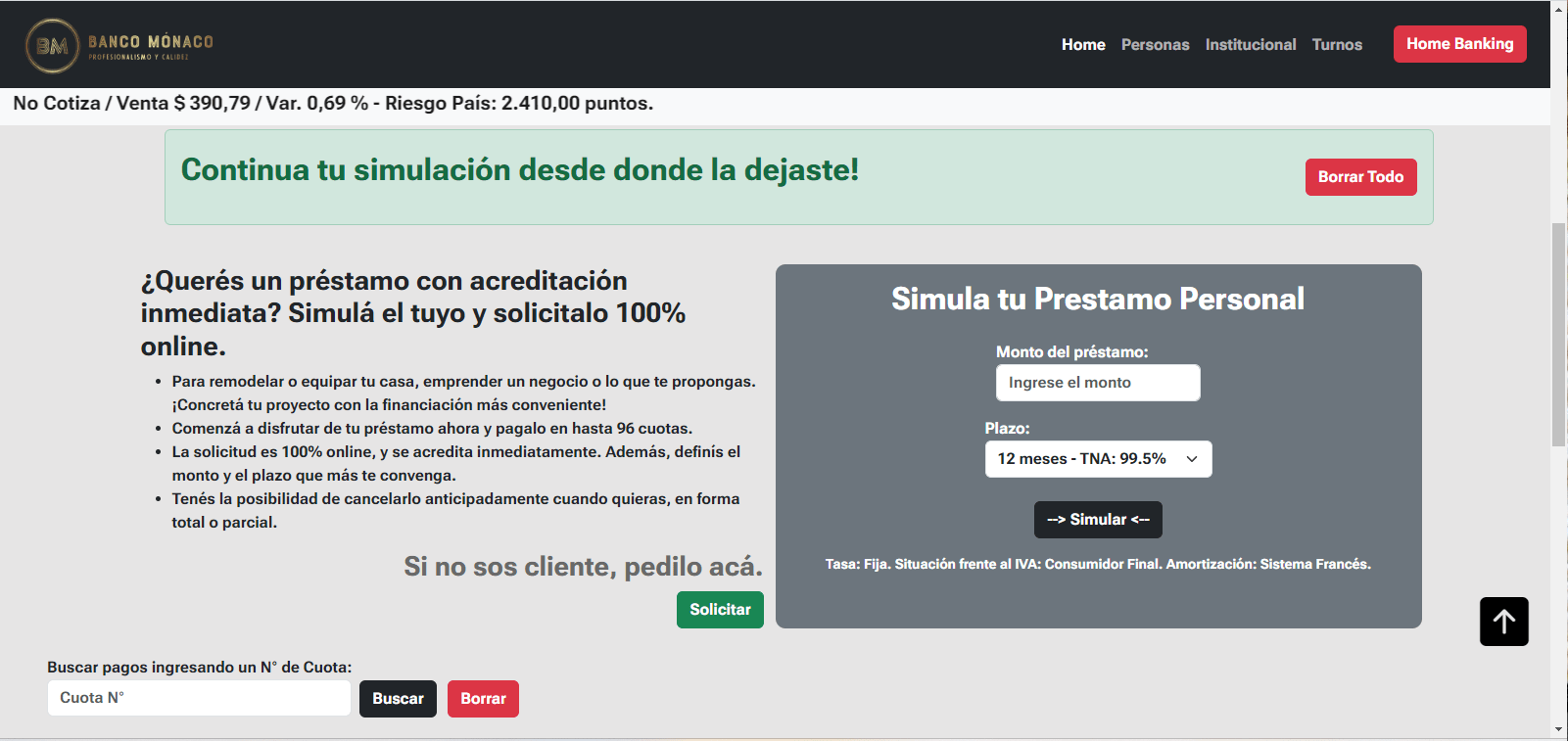 Proyecto final del curso JavaScript de CoderHouse, modelo de sitio web de una entidad bancaria llamada "Banco Monaco", donde se puede simular un prestamo personal y solicitarlo Online.