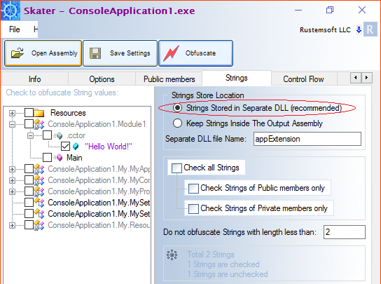 Note. You must include the Separate Strings DLL into your product distribution package and install your final .NET assembly strictly together with that DLL file. Otherwise your .NET assembly will not work. This mechanism is designed to ensure that .NET assembly browsers cannot see and decipher the output assembly’s String objects. It makes String values completely invisible.