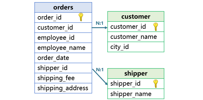 One type of joins is foreign key-based join, where a table’s ordinary field (foreign key) is associated with the other table’s primary key. Both the relationship between orders table and customer table and that between orders table and shipper table are foreign-key based.