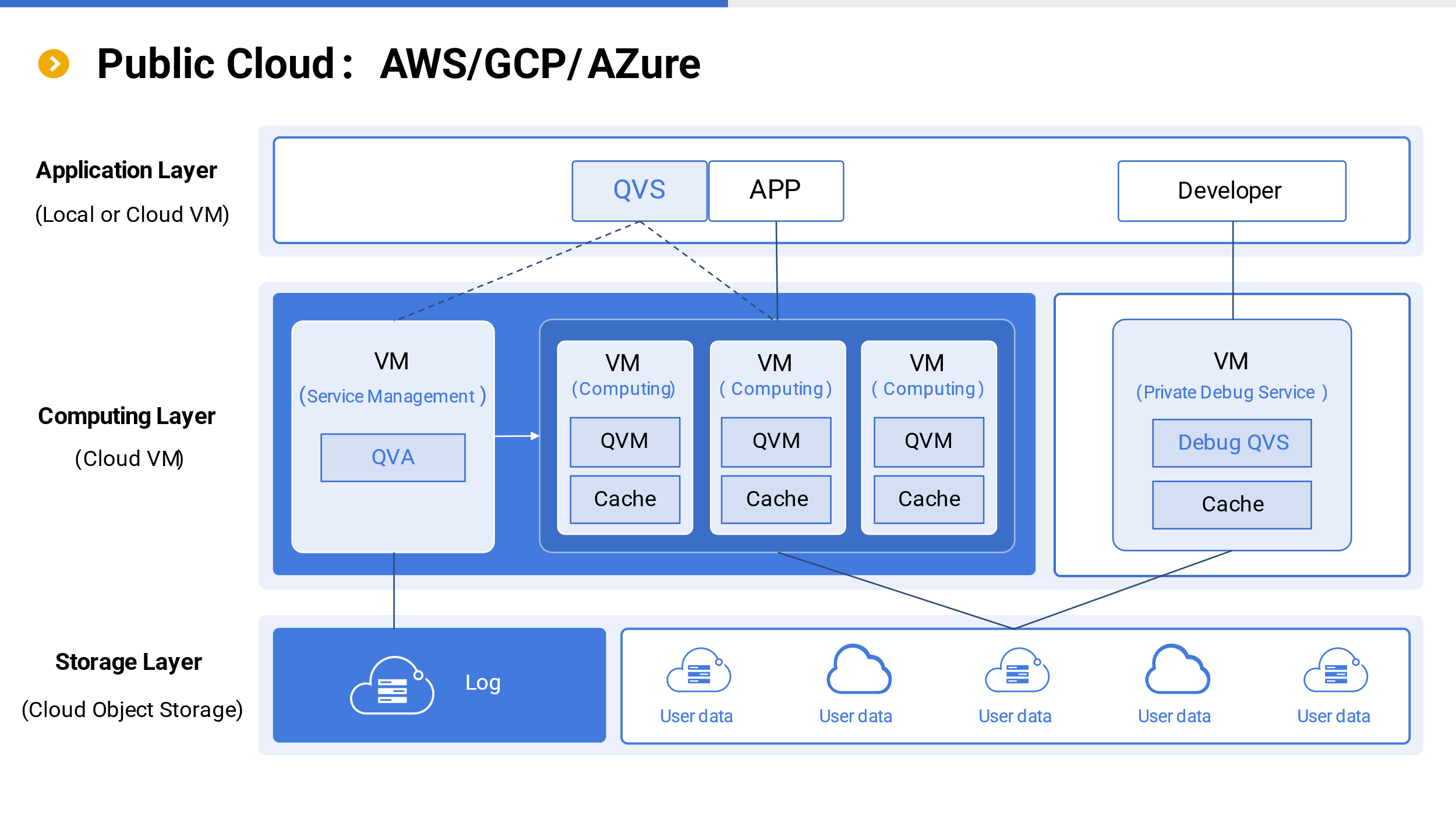 The right part of the computing layer is the QVS service for development and debugging. Similar to storing user data on their own cloud, QVS for debugging services is also deployed on the user's own virtual machine, either on the cloud or locally. The debugging process does not consume SSC resources (without incurring fees) and is private to users, hence it is called private debugging.