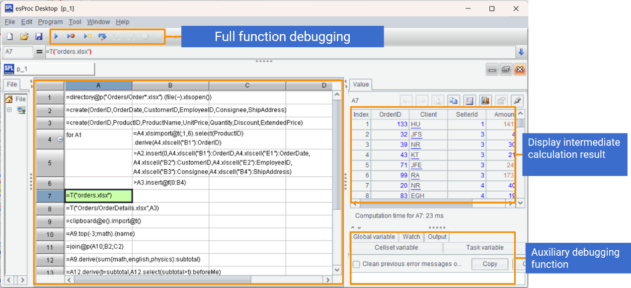 SPL also offers comprehensive debugging capabilities, including “Set breakpoint”, “Run to cursor”, “Step over”, etc. The result of each step is displayed in real-time on the right side of the IDE. This is convenient as users do not need to split away each subquery or perform manual print any more.