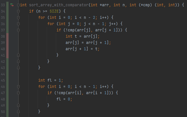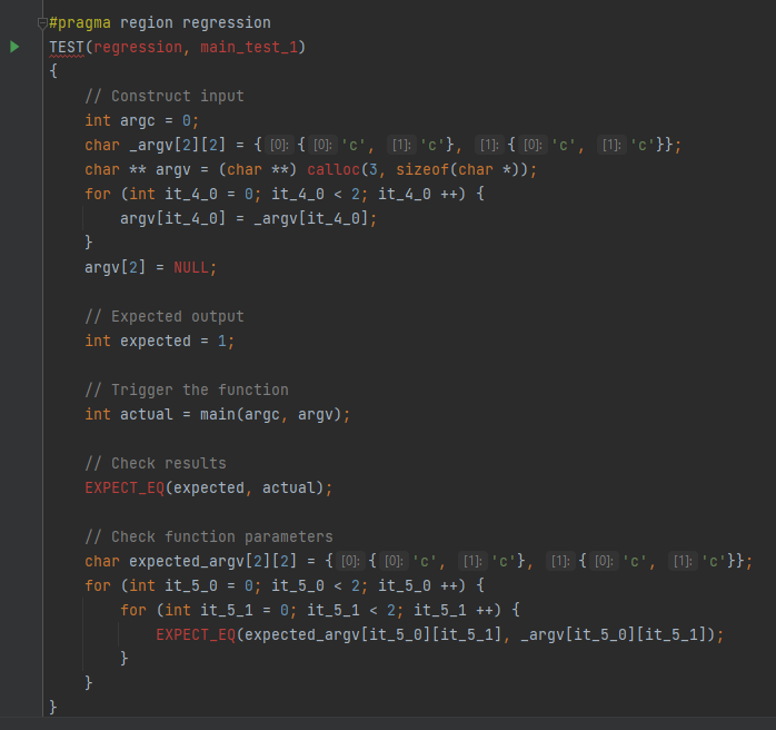 UnitTestBot C/C++ displays the test run results near the test headers. The green signs mark the passing tests, while the red ones mark the failing tests.