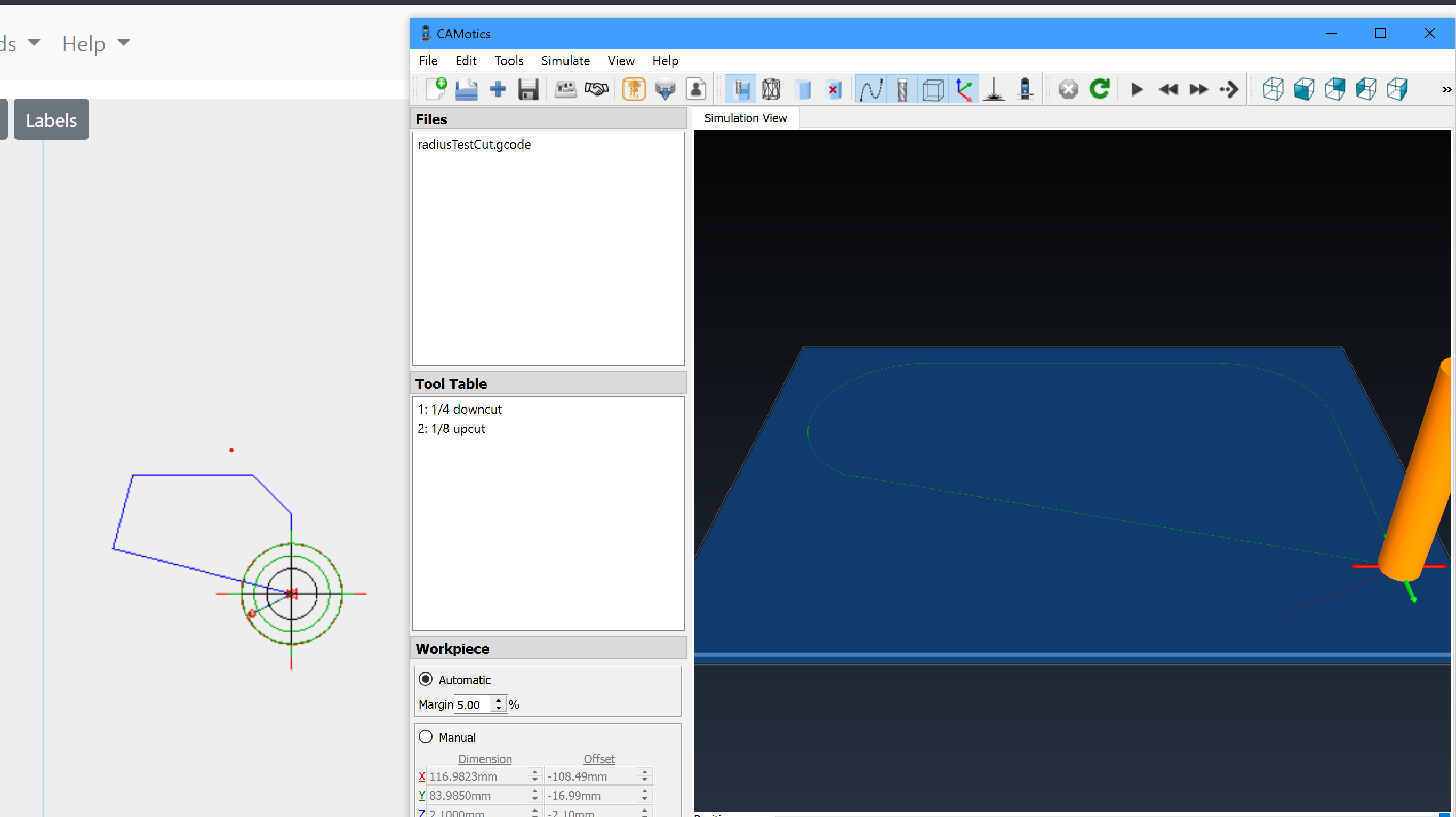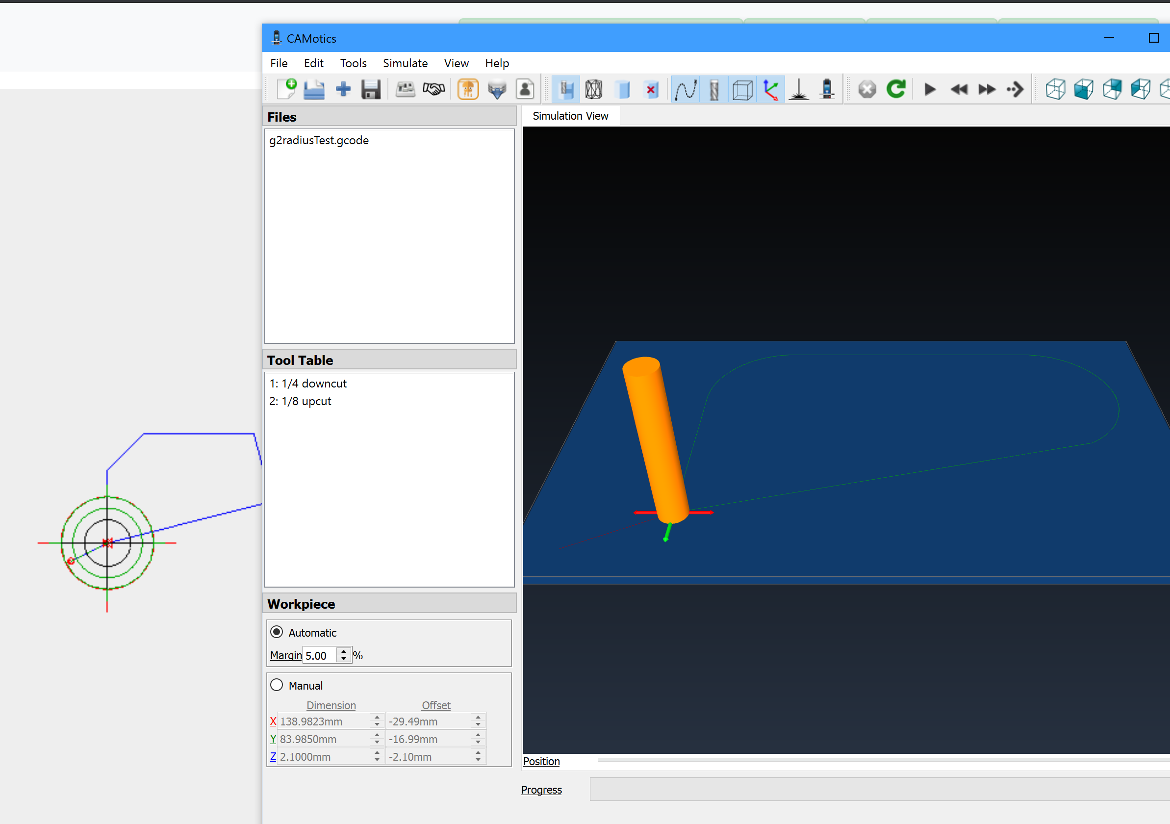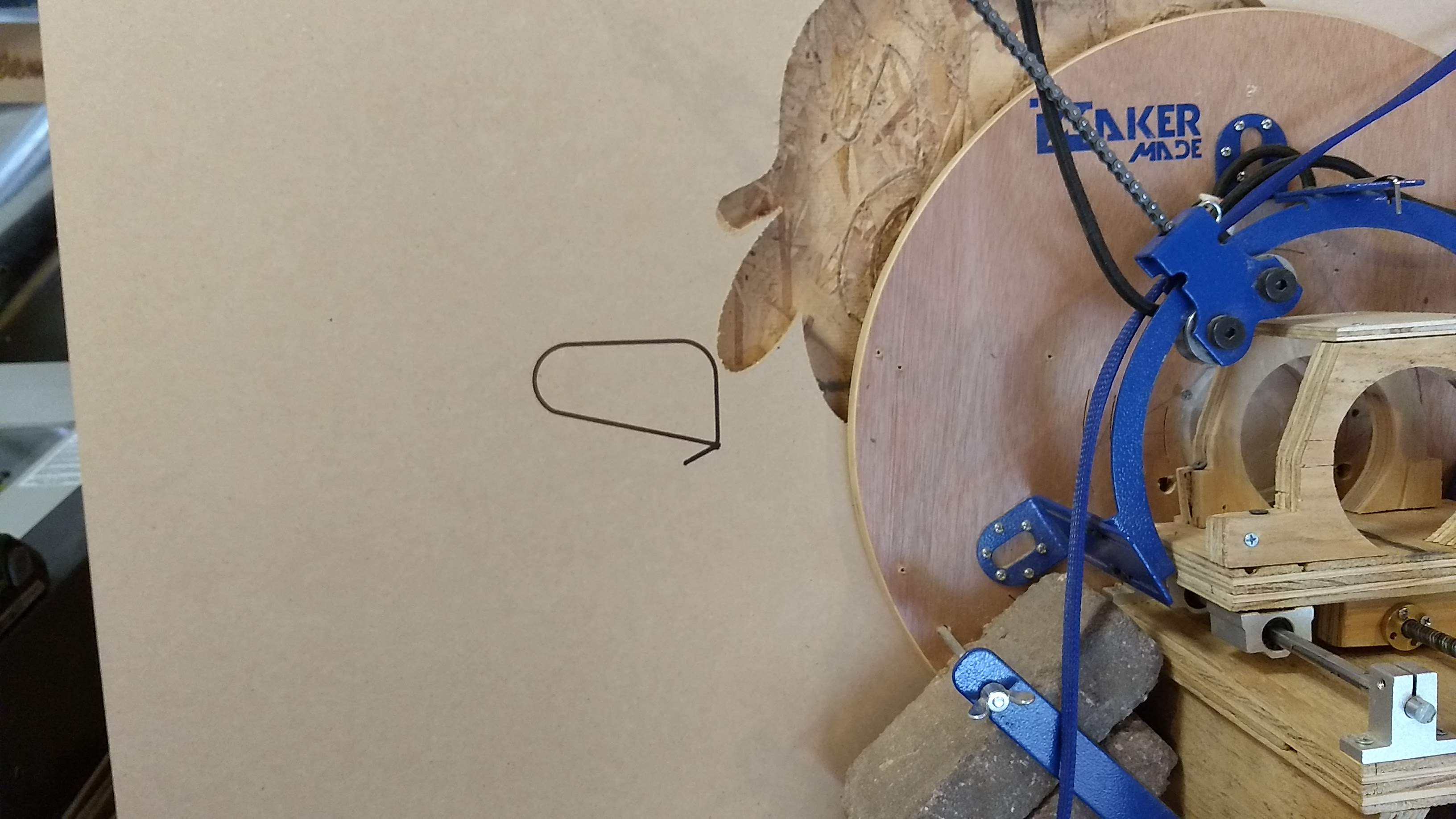 All things considered, testing was a success. I successfully compiled and flashed the firmware using webcontrol (separate story if desired). Loaded the new webcontrol and ran G3 and then G2. I have attached a screenshot of what they looked like and a picture of the marker on my board. The G2 path was over a hole, but it ran. A strange thing then occurred after I moved the sled over to a spot where the marker could trace the G2 gcode again. Pressing play, it sends 8 lines and then just sits there. It would work for G3, but not the G2. Looking at the log, there was a buffer overrun condition, so after turning off the maslow setting "buffer gcode," it worked fine. Item of interest: the webcontrol visualizer does not handle R, so the arcs look like straight lines in the webcontrol board, but when the sled moves, it goes off the line and you can see the arc as the red reticle travels. note: I run everything in metric, so I muliplied X Y coordinates everything by 10 and in mm. With a feed rate of 500. These are the files that were run:G3M3 G90 (Footer) G2M3 G90 (Footer) |