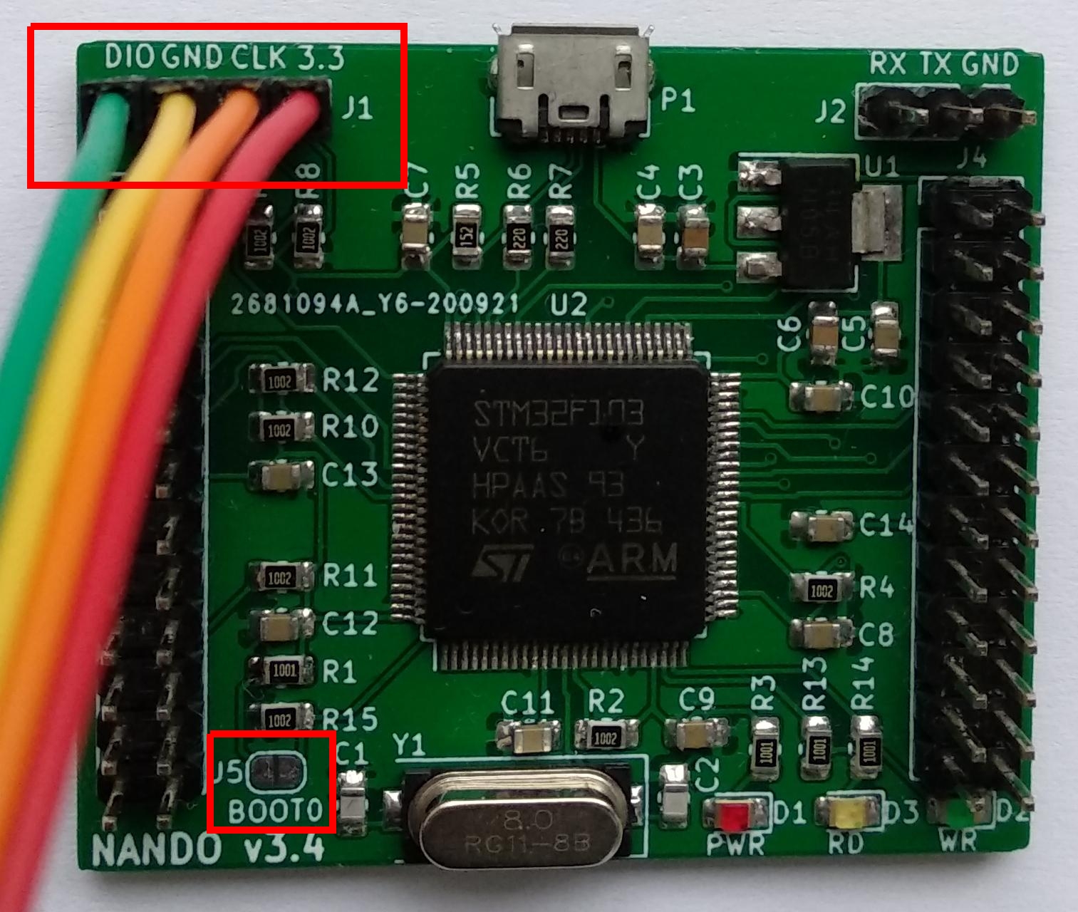 Brand-new MCU may require to be powered on with connected BOOT0 pins and sometimes additionally with RST pins (available in new PCB).