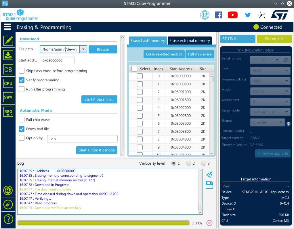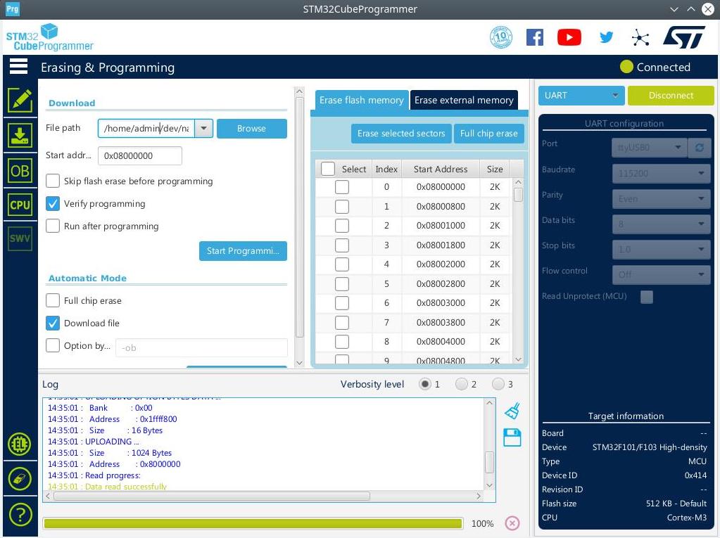 - Write firmware using STM32CubeProgrammer programmer. On Linux permission for /dev/ttyUSBx must be granted (sudo chmod 777 /dev/ttyUSB0).
