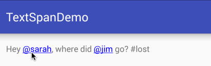 textView.setText("Hey @sarah, where did @jim go? #lost");