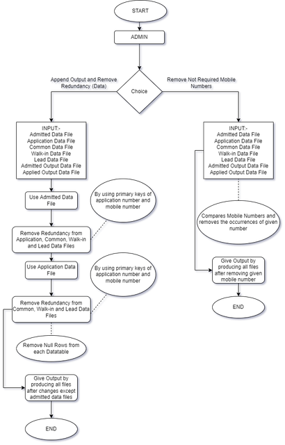 • It will remove redundancy of data from Application, Common, Walk-in and Lead Data Files based on Admitted Data File using mobile number and application number as primary keys.