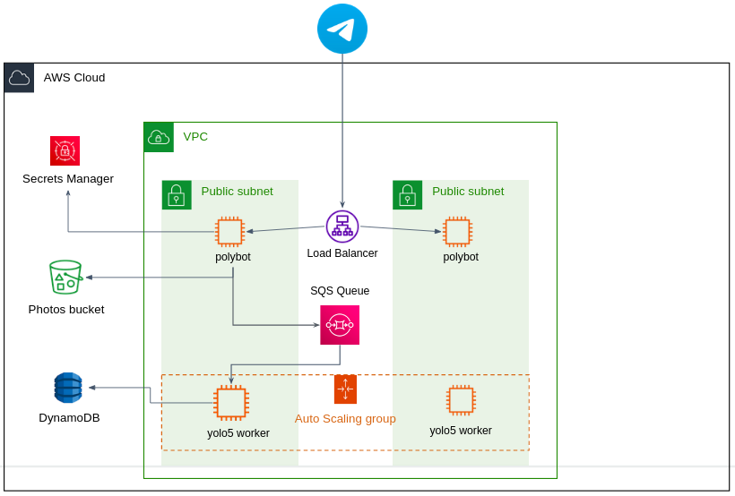 mediumEC2 instance. The service files can be found underyolo5/. Inapp.pyyou'll find a code skeleton that periodically consumes jobs from an SQS queue. - Polybot -> Yolo5 communication: When the Polybot microservice receives a message from Telegram servers, it uploads the image to the S3 bucket.