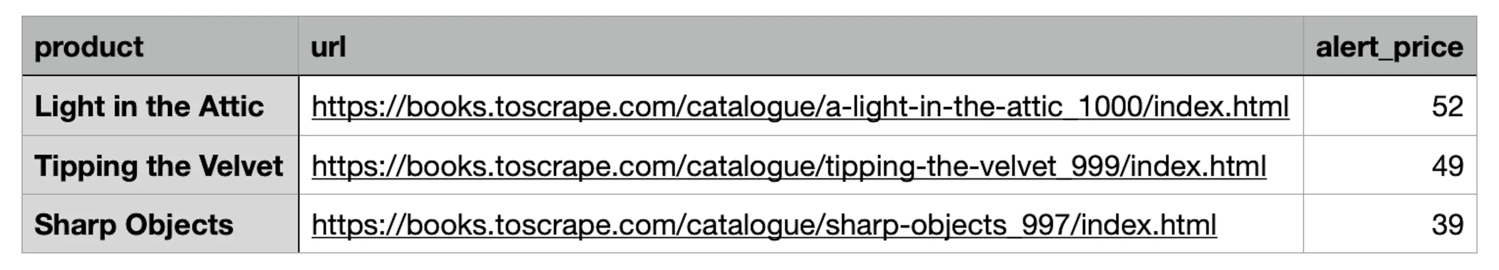 return dfThe function will return a Pandas’ DataFrame object that contains three columns — product, URL, and alert_price (see the image above).