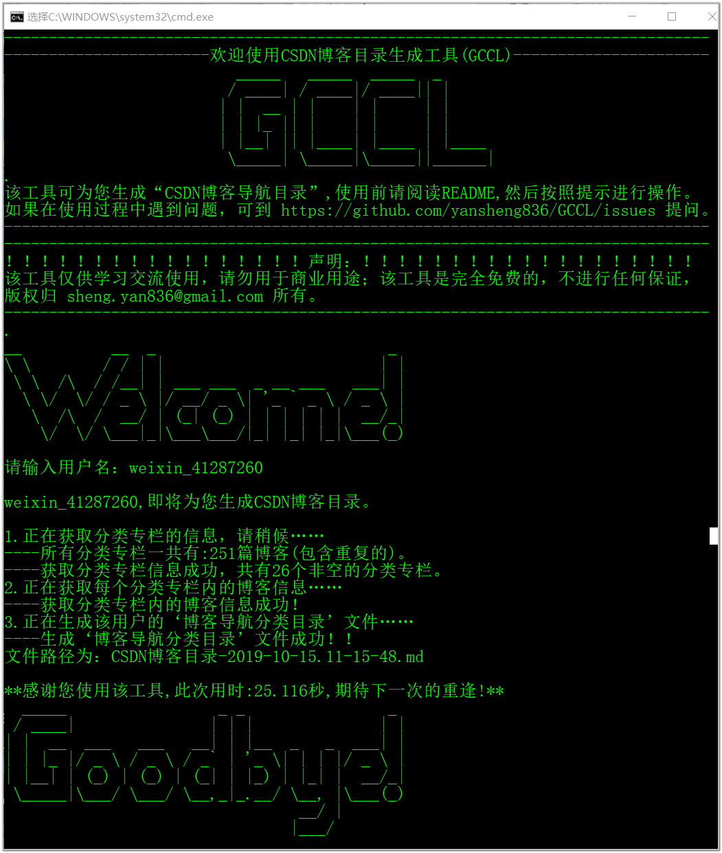 然后输入用户名,稍等片刻,即可在当前目录生成CSDN博客目录.md文件,复制到CSDN的markdown编辑器即可,当然你也可以添加一些说明。
